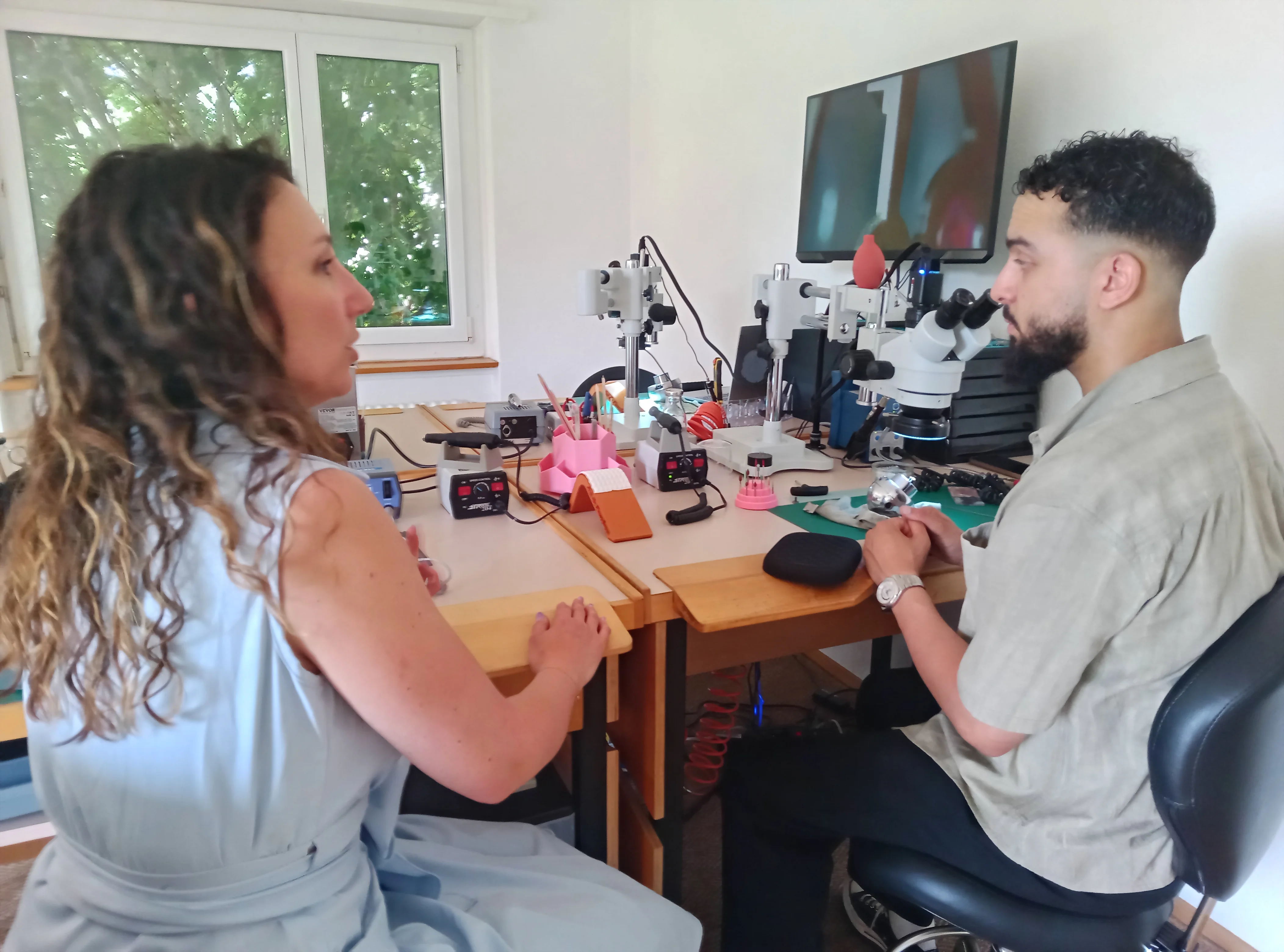 La première correction porte sur la lecture de la lumière. Si le reflet casse, Alexandra vous montre immédiatement où regarder et ce qui doit être repris. Vous retournez alors à l’établi avec un point précis à tenir, pas avec une consigne vague.